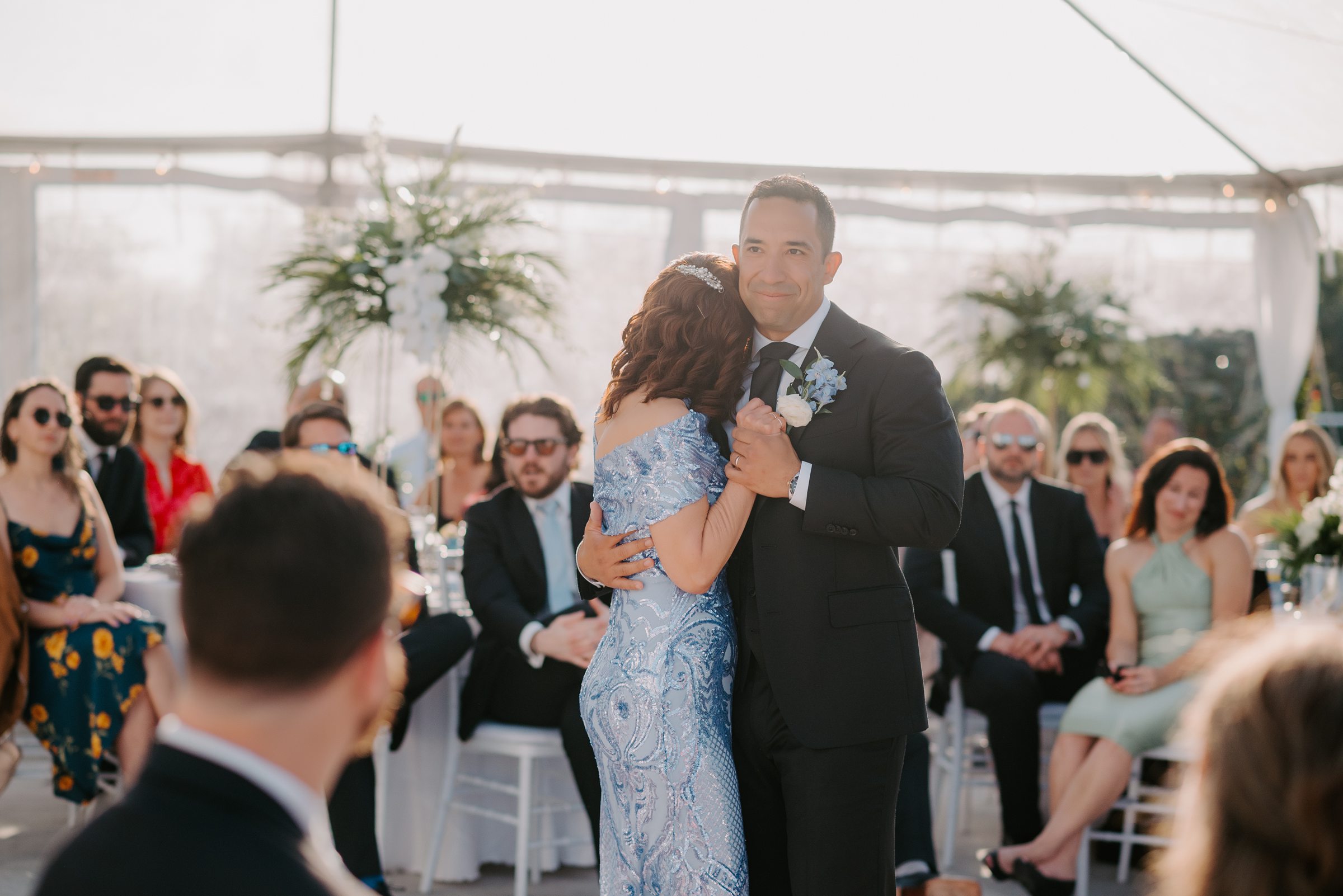 Tropical greens — lush, saturated, alive — anchored every floral arrangement and table detail. Gold accents threaded through the design like something warm and effortless, catching the Florida light and reflecting it back in ways that made the outdoor terrace glow. And the bridesmaids? They wore shades of blue — from soft dusty sky to deep ocean — each slightly different, each gorgeous, and together creating a palette that felt like the lagoon itself had been invited to the wedding.